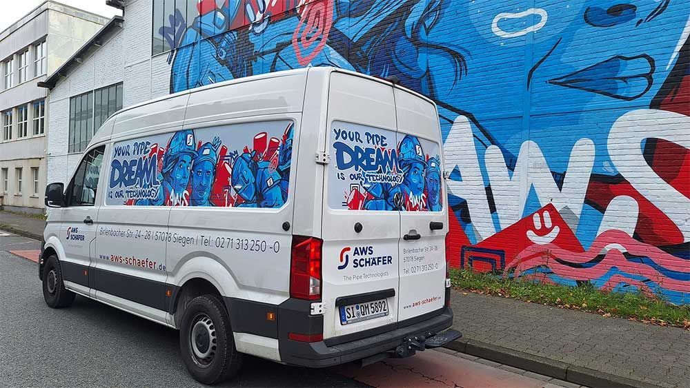 Wir haben das Graffiti auf der Werkshalle von AWS Schäfer in Geisweid grafisch aufgearbeitet und auf den Transporter foliert. Nun ist das Graffiti auch auf der Straße unterwegs.