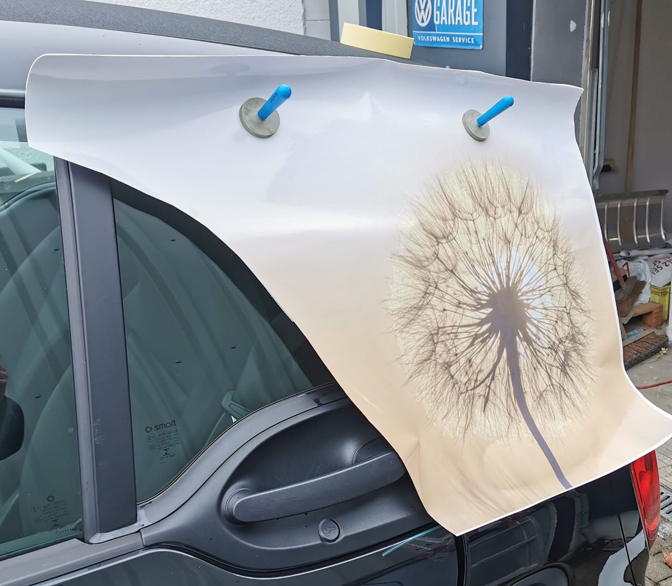 - KfZ-Teilverklebung: Folierung von Teilflächen des Fahrzeugs mit digital bedruckten oder geplotteten Folien